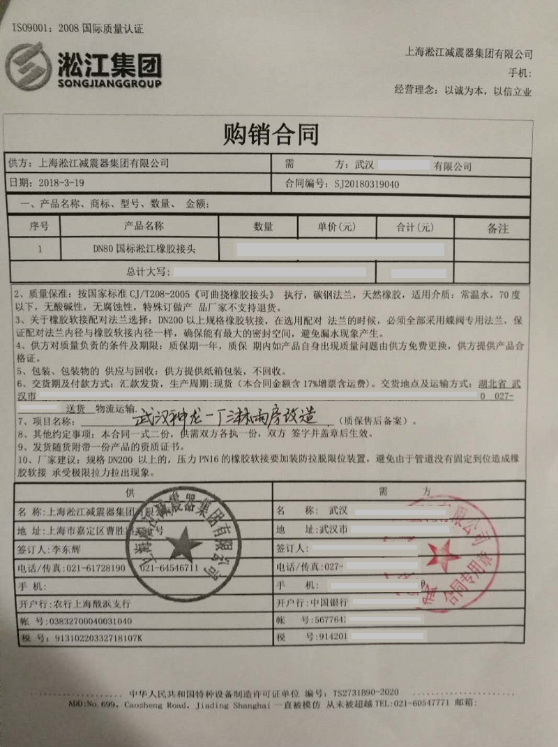 以下是神龙*厂淋雨改造武汉工程采购我公司橡胶接头产品真实合同,本合同只作为*货证明,请勿转载,谢谢!